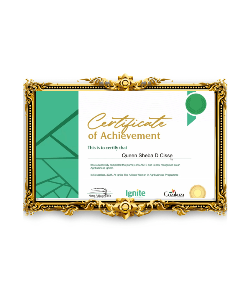 * Ignite – Queen Sheba D Cisse won The MOST PERSISTENT AWARD presented in Agribusiness – *Guzakuza