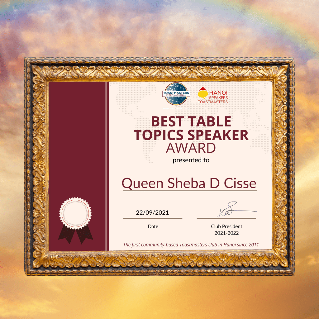 Queen Sheba D Cisse Awarded Best Table Talk Speaker – * Hanoi Toastmasters International