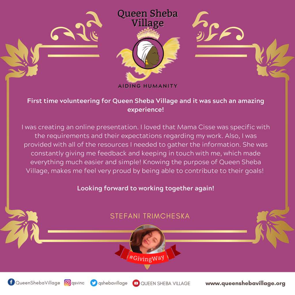 First time volunteering for Queen Sheba Village and it was such an amazing experience! I was creating an online presentation. I loved that Mama Cisse was specific with the requirements and their expectations regarding my work. Also, I was provided with all of the resources I needed to gather the information. She was constantly giving me feedback and keeping in touch with me, which made everything much easier and simple! Knowing the purpose of Queen Sheba Village, makes me feel very proud by being able to contribute to their goals! Looking forward to working together again!