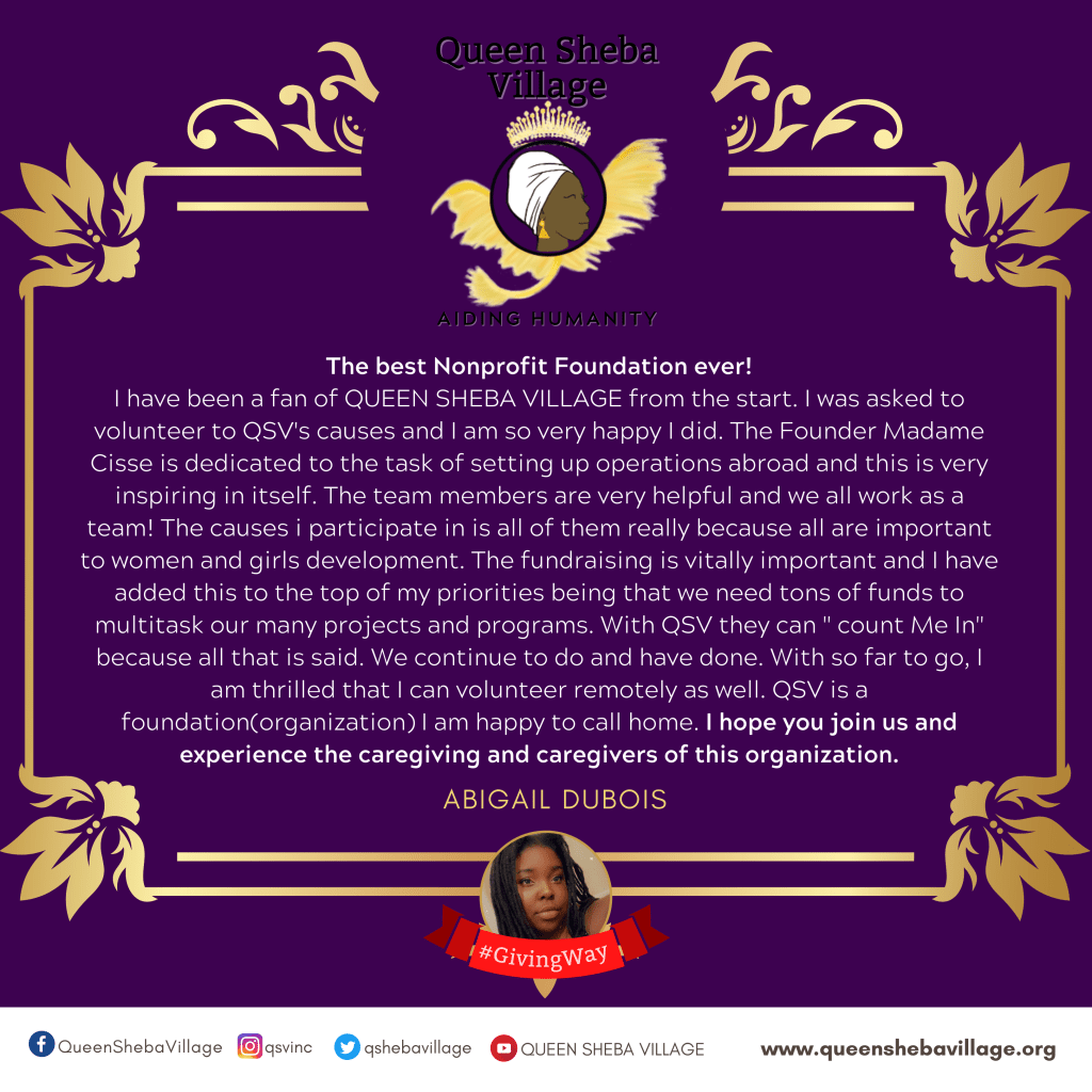 I have been a fan of QUEEN SHEBA VILLAGE from the start. I was asked to volunteer to QSV’s causes and I am so very happy I did. The Founder Madame Cisse is dedicated to the task of setting up operations abroad and this is very inspiring in itself. The team members are very helpful and we all work as a team! The causes i participate in is all of them really because all are important to women and girls development.